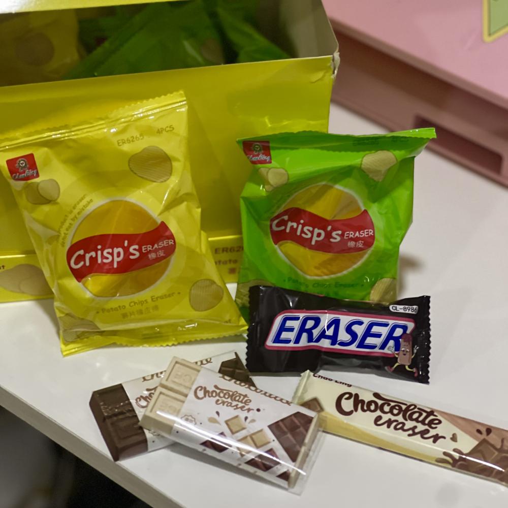 عبارة عن مغلف ممحاة مدرسية على شكل شوكولاتة أو شبس ستصلكم قطع عشوائية في حال حاب نوع معين اضغط على ملاحظة وقم بتحديد المنتج