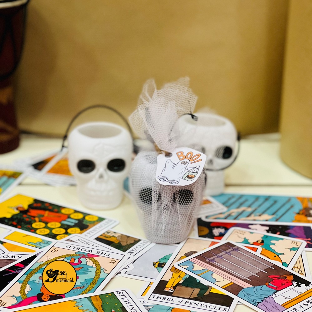 مكونة من 5 توزيعات عبارة عن وعاء جماجم بداخلهم حلويات الجماجم ومغلفين بتول مع كروت للهالوين.